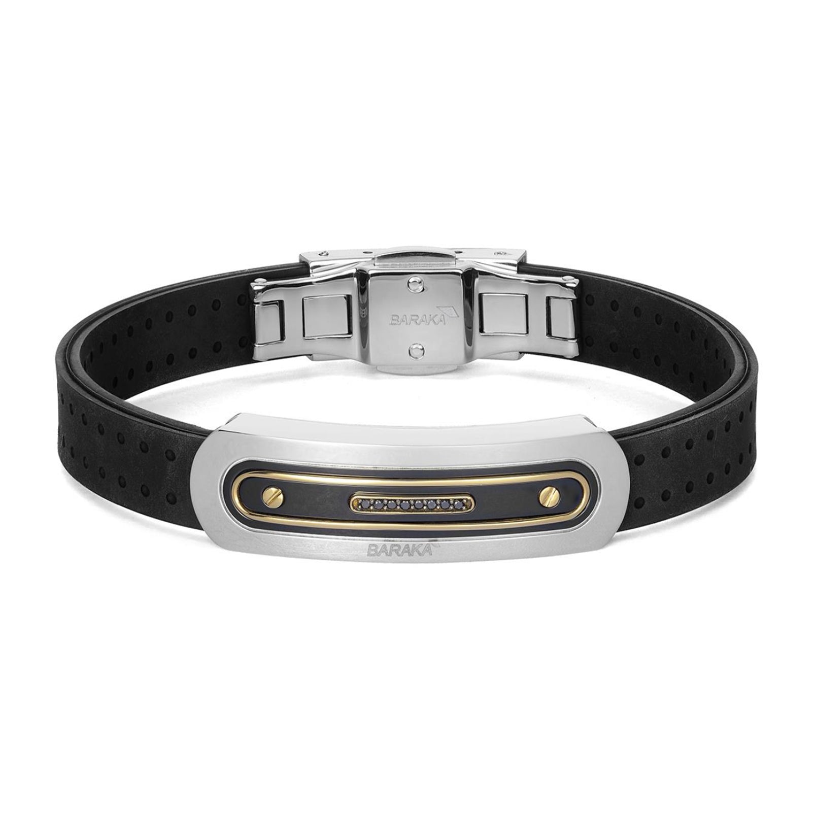 Break the mold. The Baraka Vortex BR372101GIDN-06 is not just a bracelet — it’s an attitude. Black PVD, gleaming yellow gold, and a rugged rubber strap meet the icy sparkle of black diamonds, hinting at an urban rhythm beneath polished surfaces.