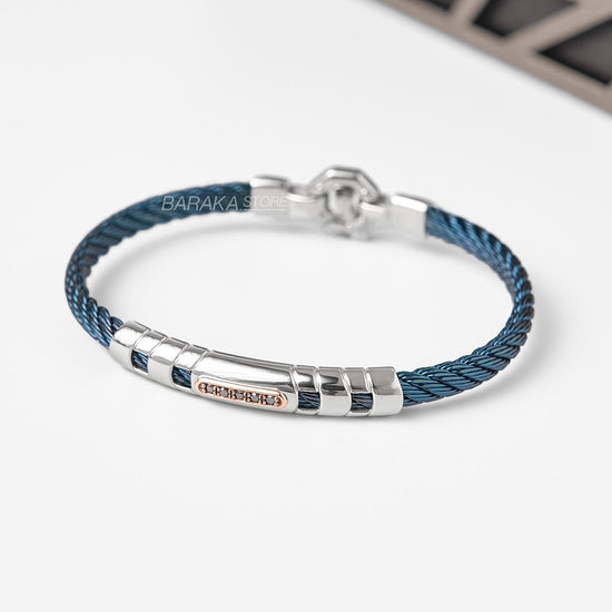 An elegant Baraka bracelet, crafted from stainless steel with a refined blue PVD coating. The warm glow of rose gold perfectly complements the depth of black diamonds, while the delicate sparkle of a white diamond set in the clasp highlights flawless craftsmanship.