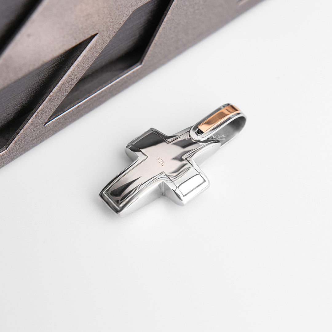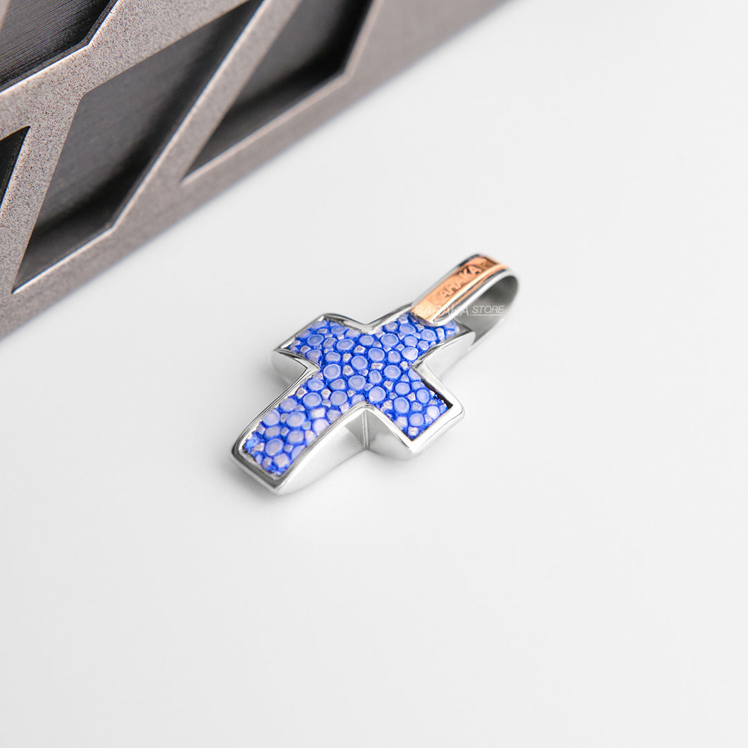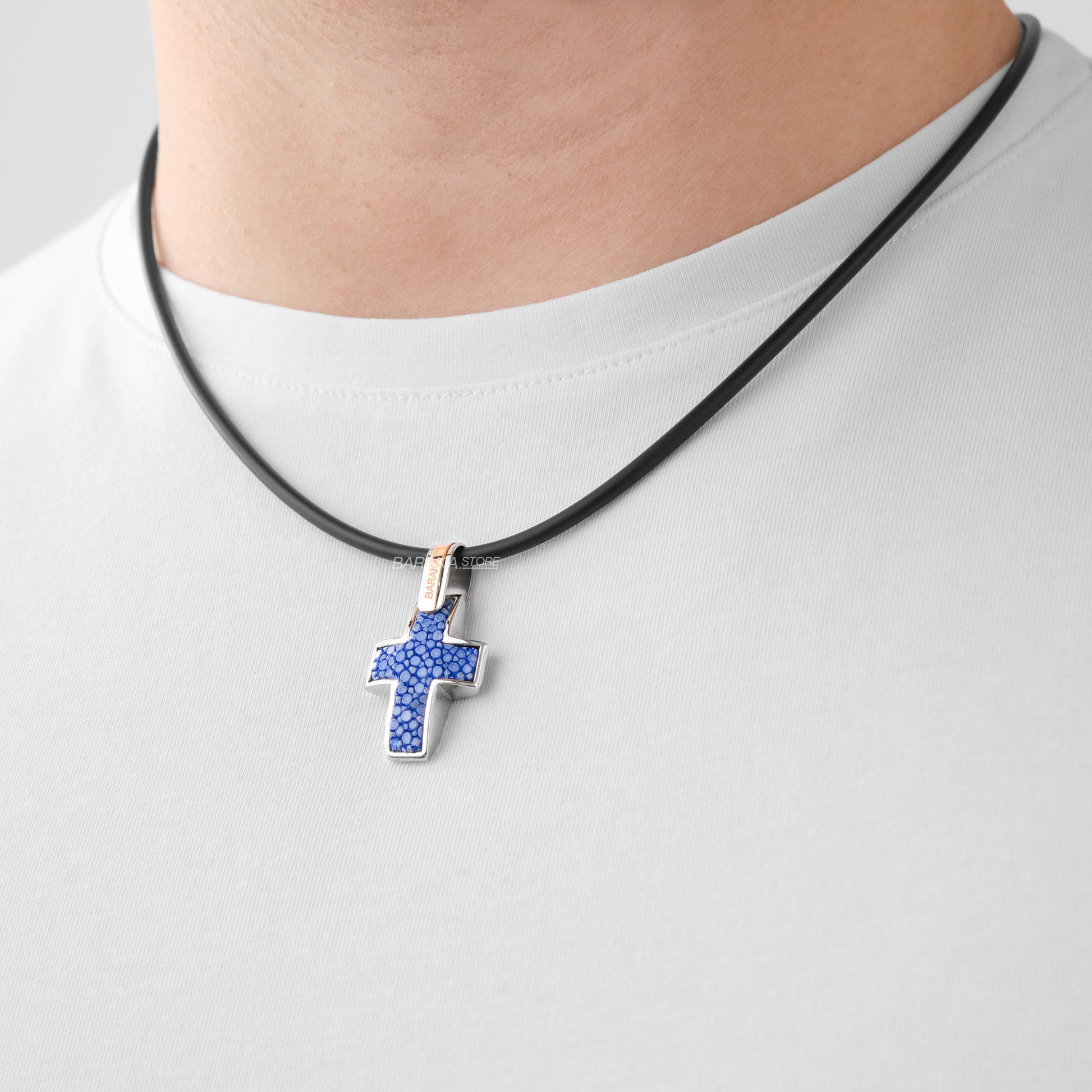 Cruz de acero inoxidable con piel de raya azul y oro rosa.