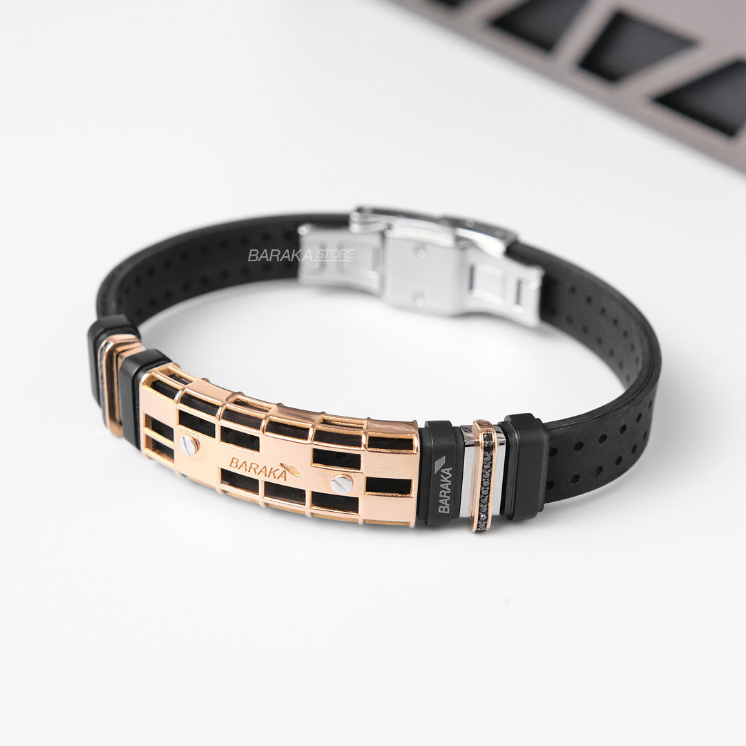 Men's bracelet with rose gold and black diamonds. Stainless steel clasp. Choice of rubber or leather strap.