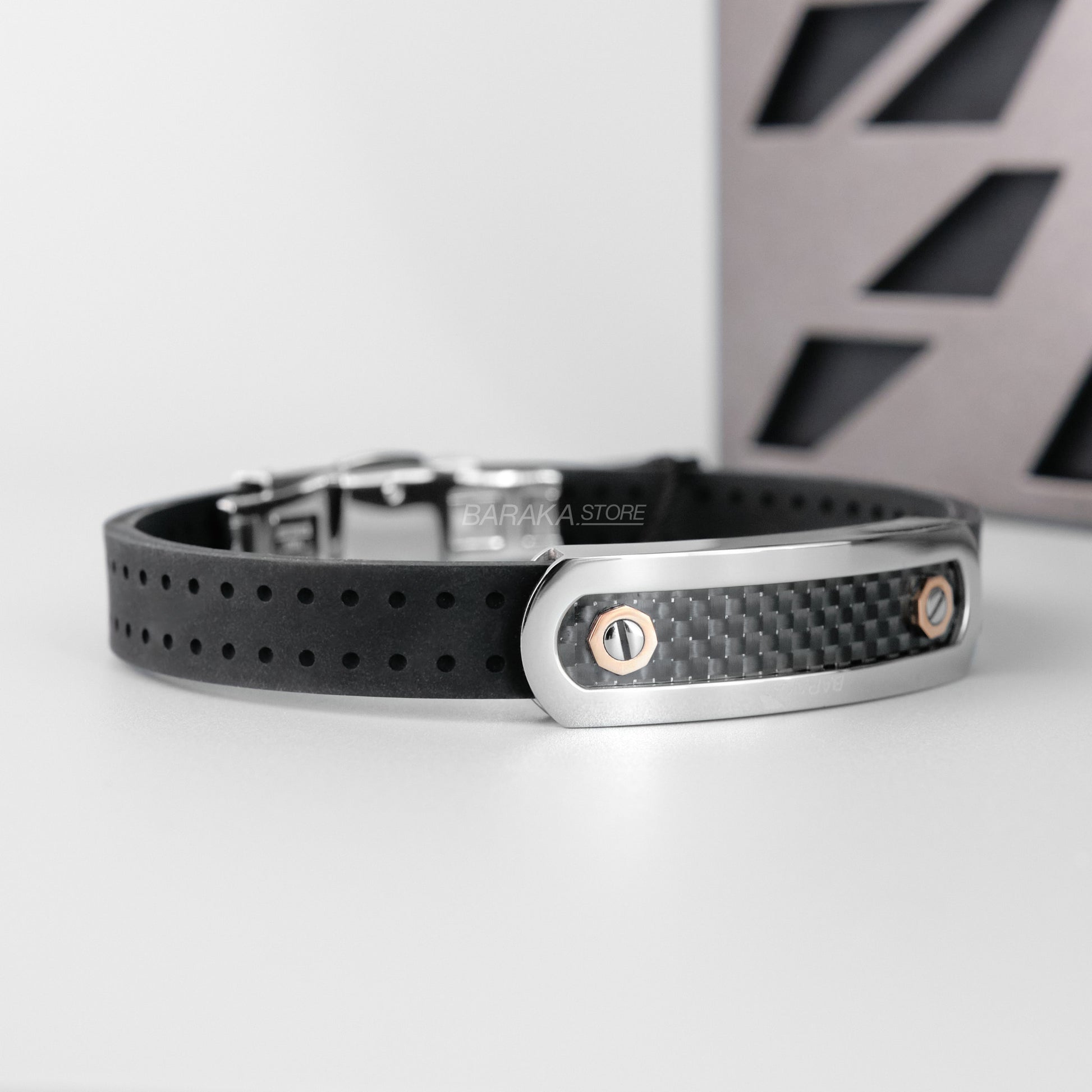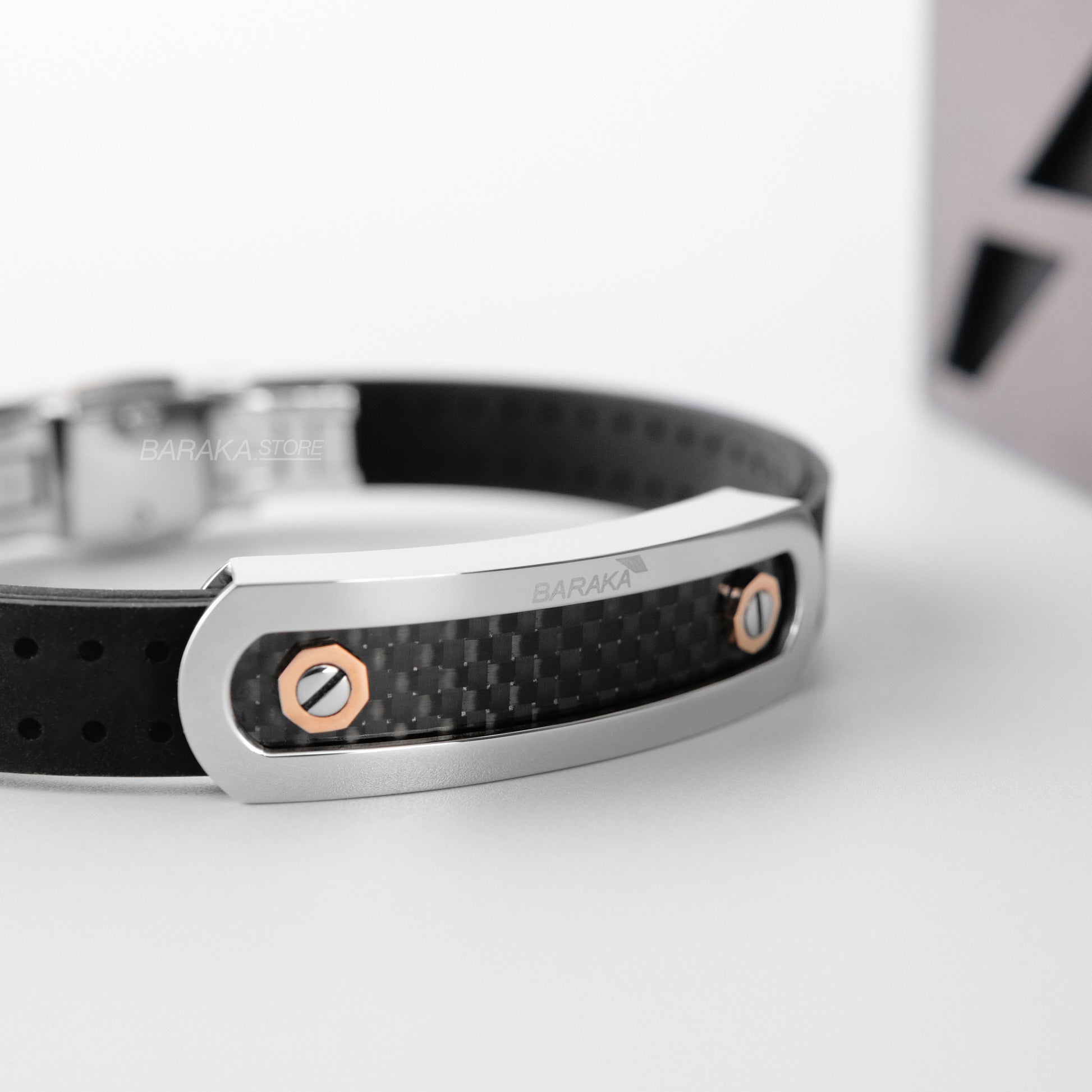 Каучуковый браслет со вставками из нержавеющей стали, розового золота и карбона.