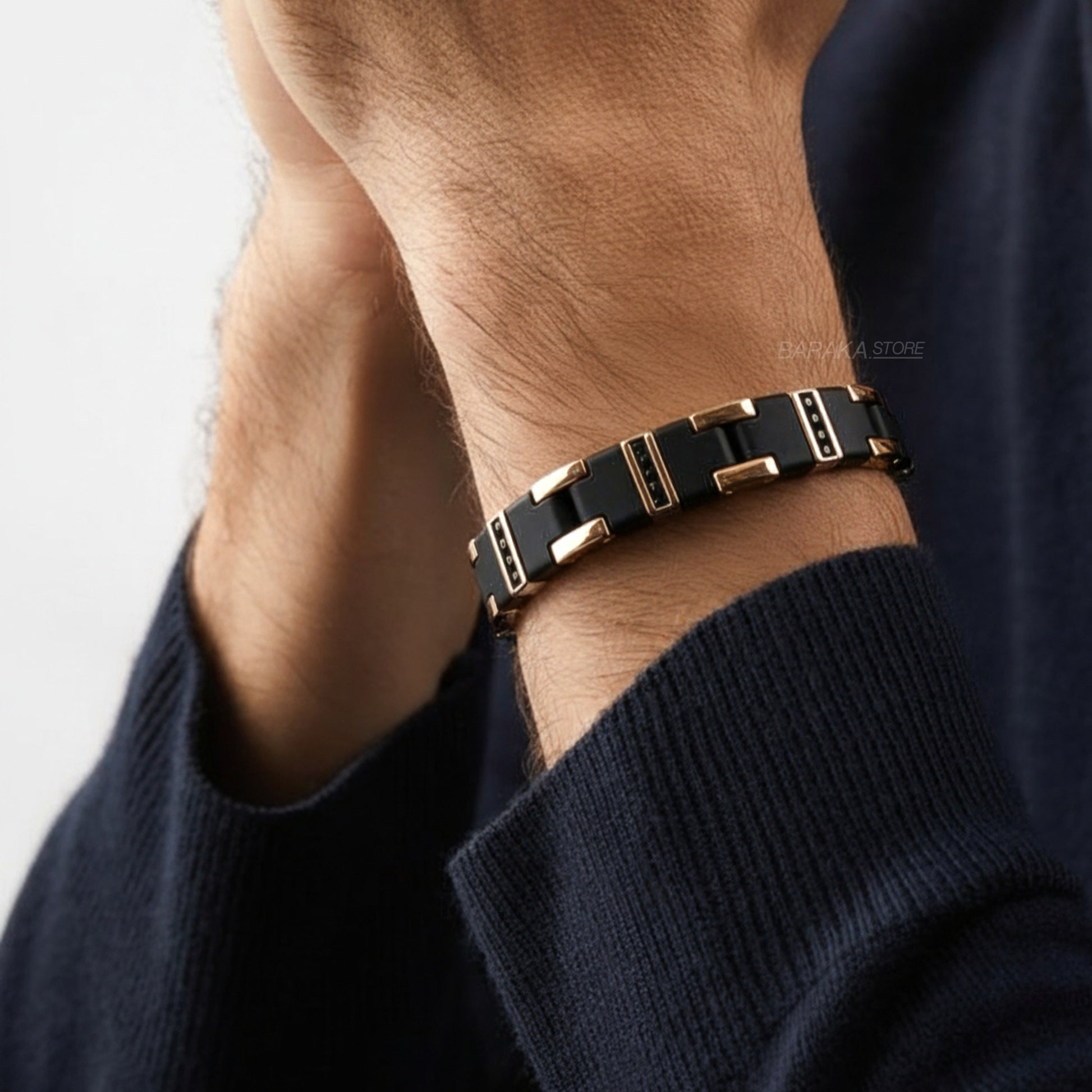 Браслет из нержавеющей стали, каучука, карбона, серебра, розового золота с черными бриллиантами.