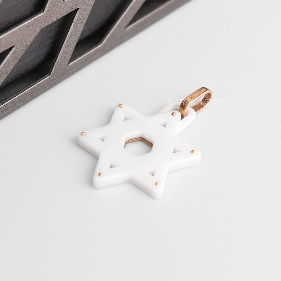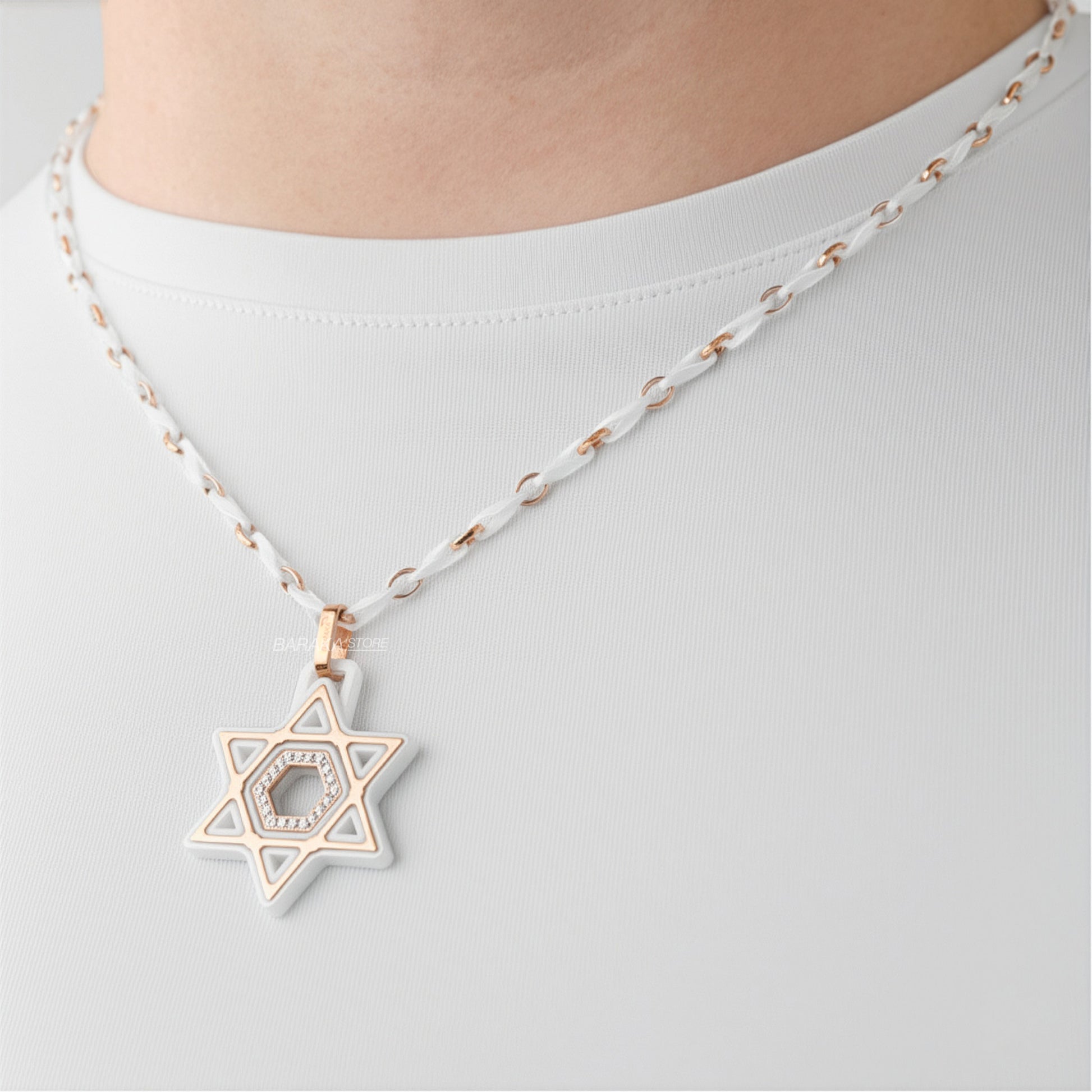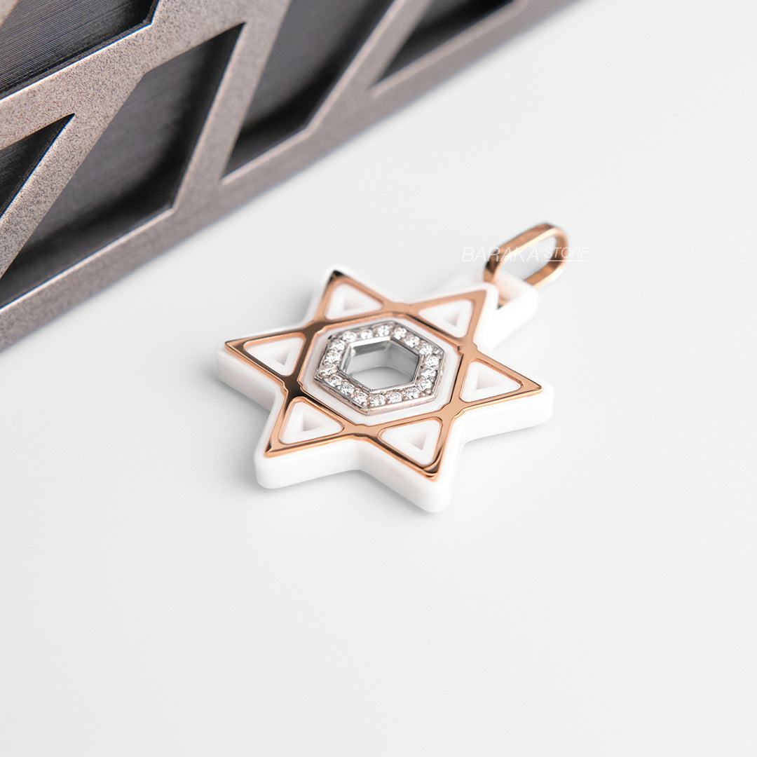 Кулон (Звезда Давида) из белой керамики с розовым золотом и белыми бриллиантами.